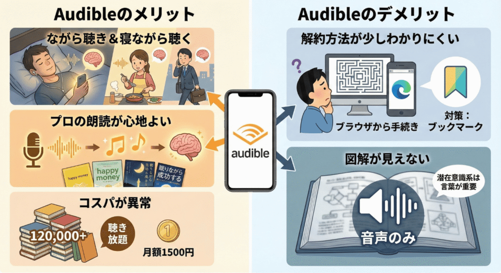 2. 図解が見えない 音声だけなので、図解が多い本は理解しにくい場合があります。ただ、潜在意識系の本は「言葉」が重要なので、音声の方がむしろ効果的だと感じています。