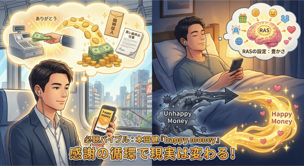 聴き放題対象作品の中で、まず最初に絶対に聴いてほしいのが、本田健さんの『happy money』です。