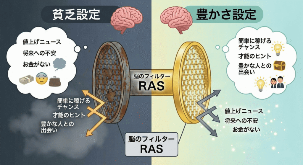 もしあなたの潜在意識に「お金=苦労して稼ぐもの」「私にはお金がない」という設定が入っていると、RASはどう働くでしょうか?